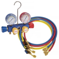 Оснащен манометром, диаметром 68 мм, встроен визуализатор хладагента для просмотра его движения и состояния. Подключение коллектора к вакуумному насосу осуществляется через напорные шланги.